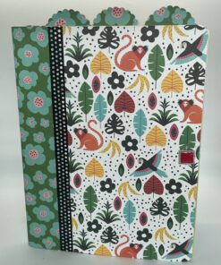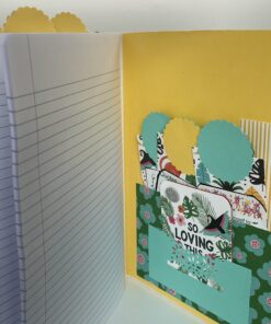 This journal proudly displays a tab at the top of four dividers, increasing the original 9.75″ height to approximately 10.5″. The pockets on the front and back covers contain journaling tags and other mini writing pads. This journal can be used to track household tasks, respond to prompts, and to have in easy reach for processing just about any idea or problem.
